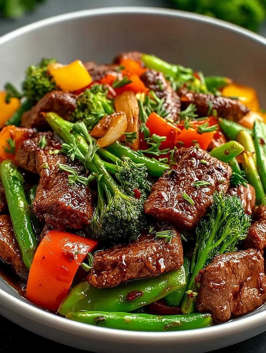 Savory beef strips sizzle in a hot wok, mingling with vibrant vegetables that pop in a medley of colors and textures, while a sauce dances like a flavor whirlwind. The aroma wafting through the kitchen? Pure culinary magic, whispering sweet promises of indulgence.