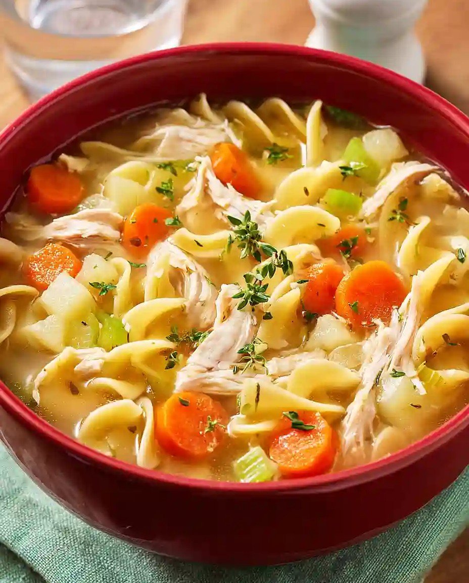 Diese Beruhigende Hühnersuppe mit Rotisserie-Hühnchen und Nudeln vereint süßliche Zwiebeln, herzhaftes Hühnchen und zarte Nudeln. Sie bietet eine ausgewogene Geschmackserfahrung und ist perfekt für kalte Tage.