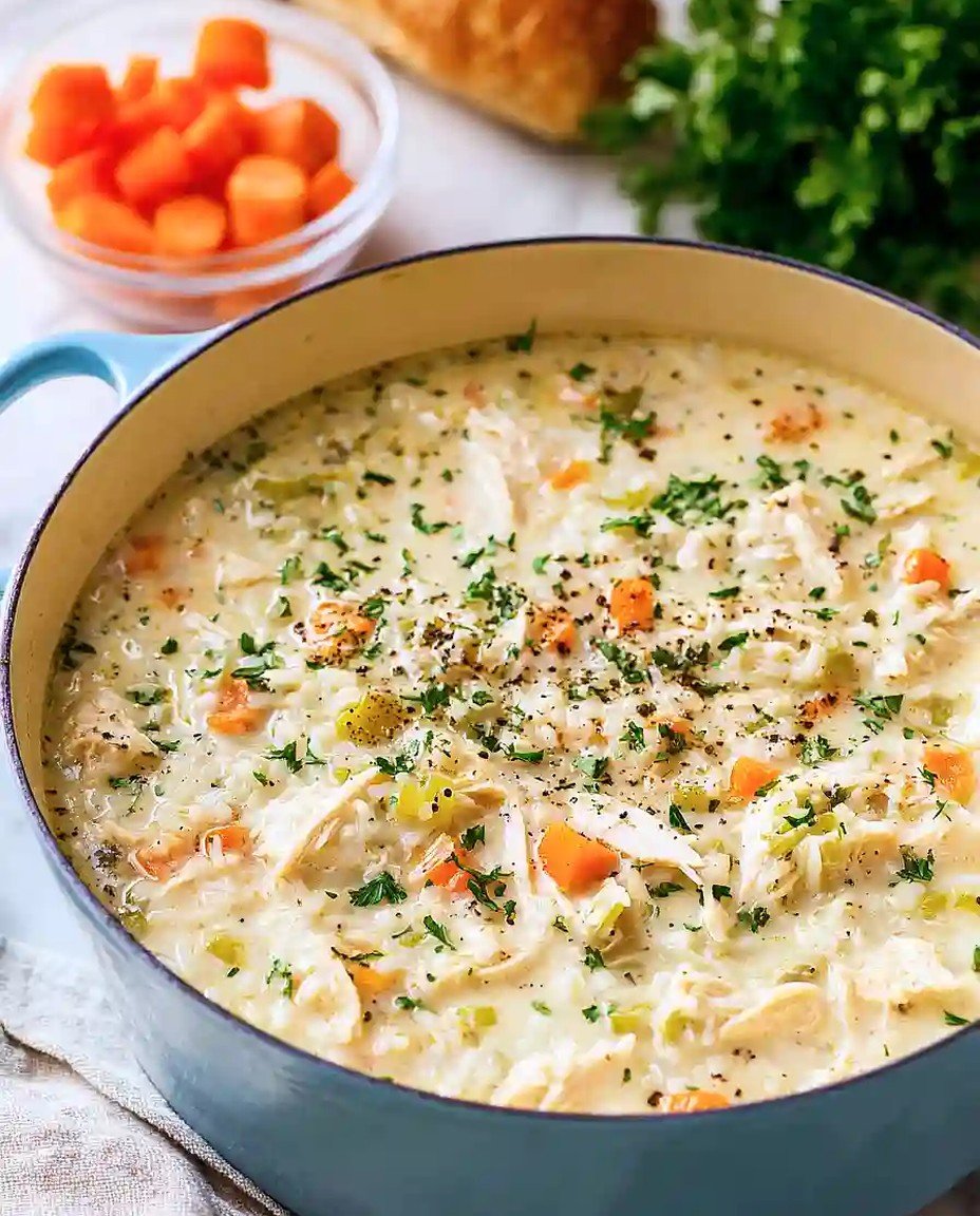 Die Aromen von zartem Hühnchen, frischem Gemüse und würzigem Reis entfalten sich in einer warmen, einladenden Suppe, die an kalten Tagen wie eine Umarmung wirkt. Kombiniert mit einer köstlichen Brühe, die für eine perfekte Balance zwischen herzhaft und cremig sorgt, ist diese Suppe ein wahres Wohlfühlessen.