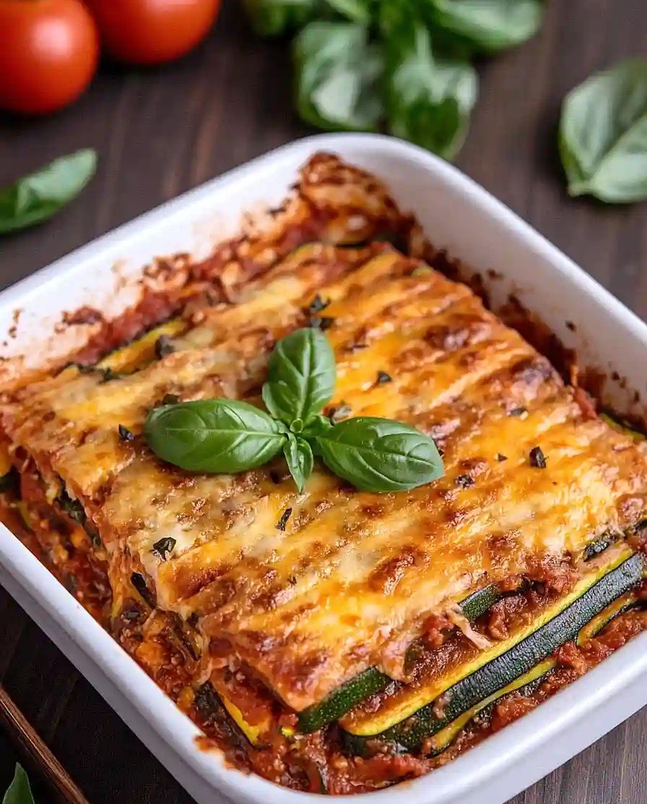Diese Zucchini-Lasagne ohne Nudeln ist ein köstliches Low Carb und glutenfreies Gericht. Sie kombiniert zarte Zucchini mit saftigem Hühnchen und einer aromatischen Tomatensoße, alles perfekt geschichtet und überbacken mit geschmolzenem Käse.