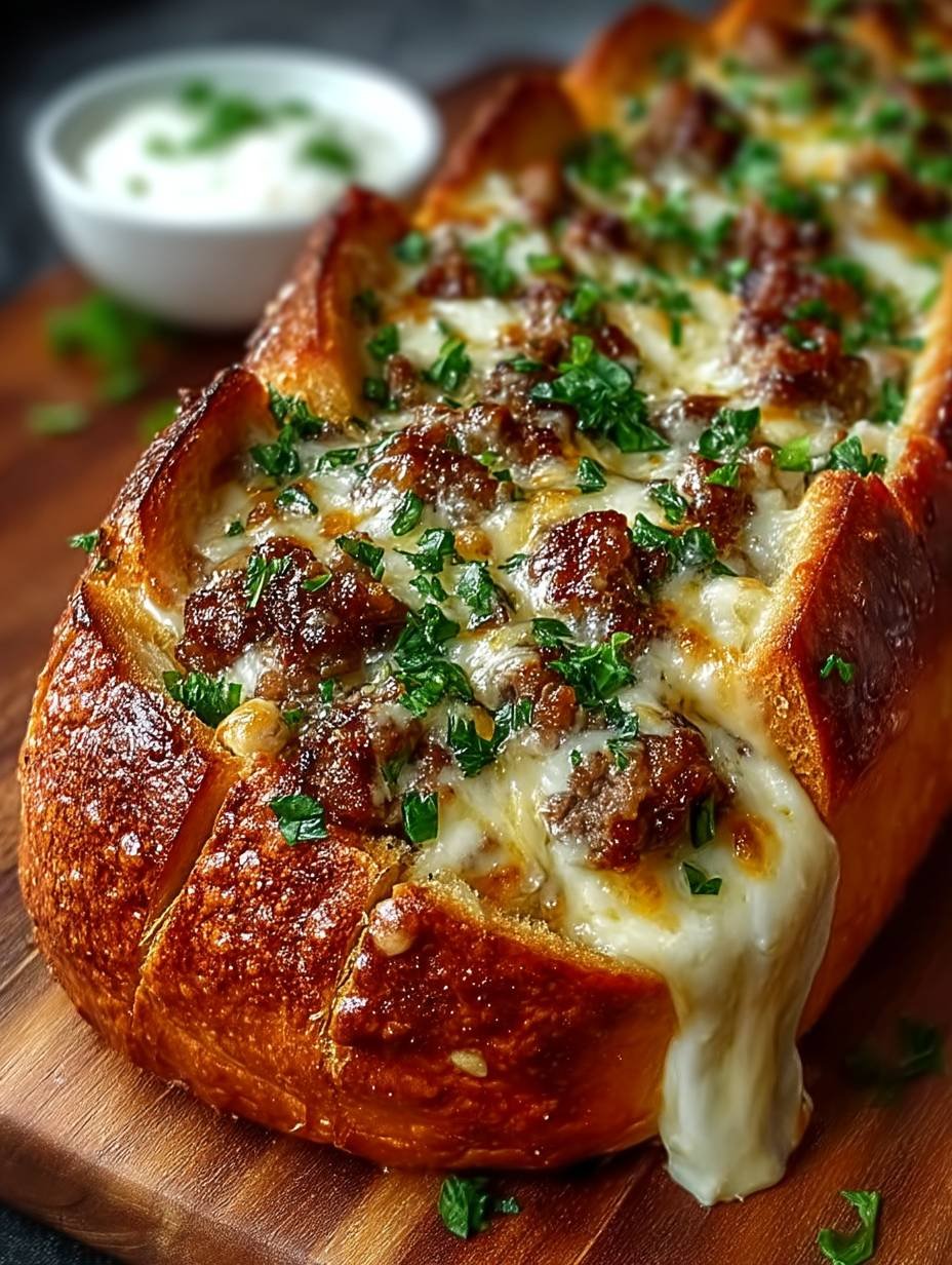To serve, slice the loaf into chunky pieces and watch as the molten cheese stretches with each pull. Garnish with freshly chopped parsley for that restaurant-grade look, and enjoy immediately for the ultimate Cheesesteak-Stuffed Garlic Bread Loaf: Comfort Food Bliss experience!