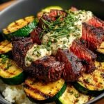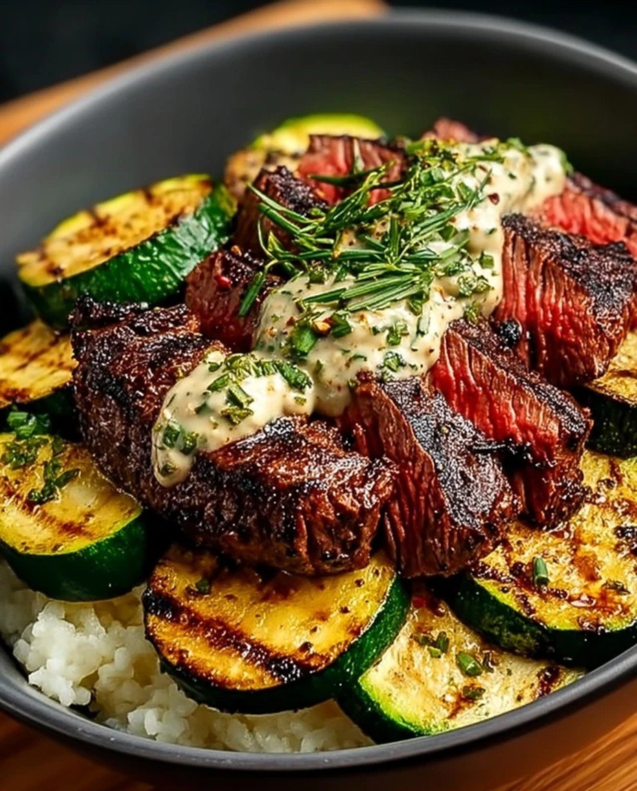 The aroma of grilled steak mingles with the fresh scent of sautéed zucchini, creating a comforting and mouthwatering experience that promises to awaken your taste buds. Juicy, tender beef topped with vibrant veggies is like a warm hug for your palate, making every bite an absolute delight.