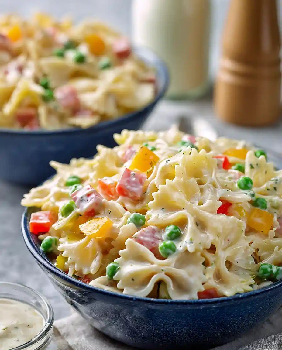 - Servieren Sie den Cremigen Farfalle-Salat auf einem großen Teller oder in einer Schüssel.
