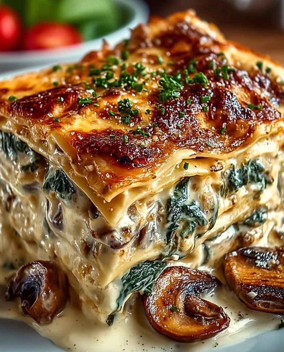 Layers of creamy goodness beckon as you savor the delightful blend of rich mushrooms and vibrant spinach nestled between sheets of tender pasta, all topped with a golden, bubbling cheese crust. Each bite promises a warm embrace of flavor that dances on your palate and leaves you craving more.