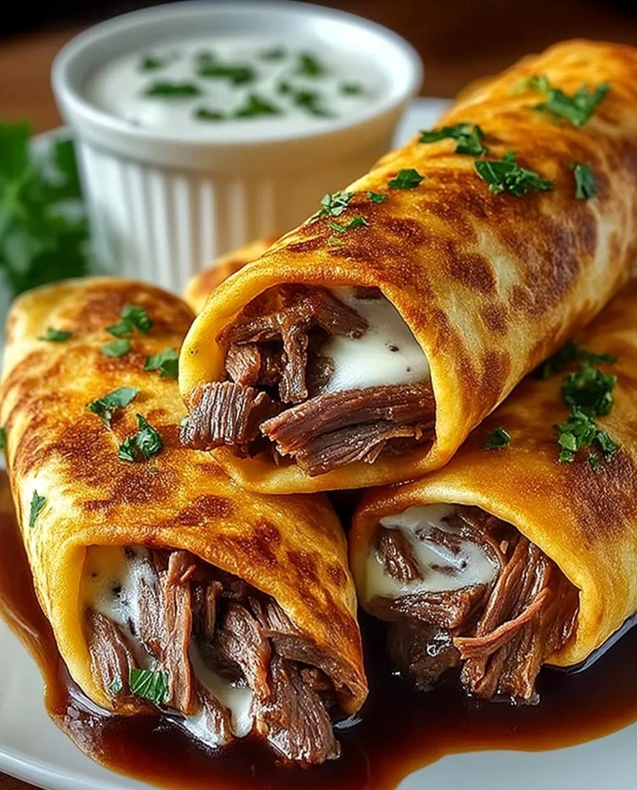 Savory layers of tender beef and melty cheese are wrapped in soft flour tortillas, creating a delightful twist on a classic French dip. Each bite bursts with the aromatic essence of garlic and herbs, making these roll-ups a fantastic option for gatherings or a quick family dinner. Easy to prepare and fully customizable with your favorite veggies or sauces, these visually appealing snacks are sure to impress without the fuss of elaborate cooking. Perfect for any occasion, these roll-ups combine comfort and flavor in every mouthful.