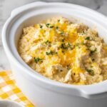 Familien-Crockpot-Hühnchen-Reis-Auflauf vereint die Aromen von zartem Hühnchen, karamellisierten Zwiebeln und cremigem Reis. Diese Kombination sorgt für ein harmonisches Geschmackserlebnis mit frischem Gemüse und intensiven Kräutern.