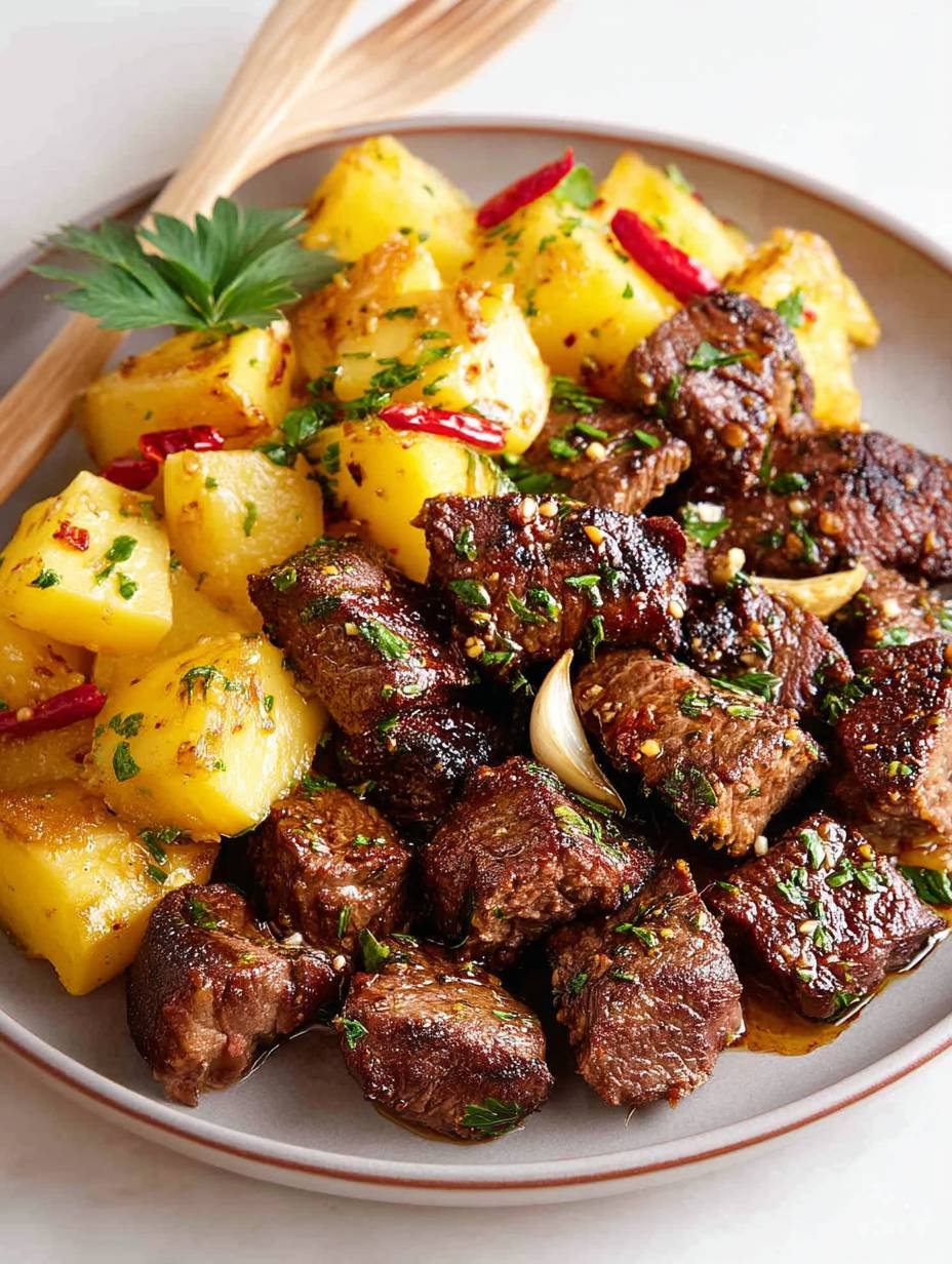 Serving: Serve the Garlic Steak Bites and Potatoes hot, garnished with fresh rosemary or parsley for an added burst of flavor. Pair with a side salad or steamed vegetables for a complete meal.