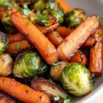 Geröstete Ahornsirup-Glasierte Karotten und Rosenkohl vereinen süße Aromen mit herzhaftem Gemüse. Dieses einfache Rezept sorgt für ein farbenfrohes und geschmackvolles Gericht, das sowohl Kinder als auch Erwachsene begeistert.