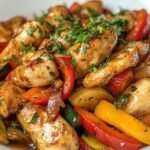 Geben Sie das zuvor gebratene Hähnchen zurück in die Pfanne und mischen Sie es gut mit dem Gemüse und der Sauce. Erhitzen Sie alles nochmals für 1-2 Minuten, damit das Hähnchen wieder warm wird und die Aromen aufnehmen kann. Schmecken Sie das Hähnchen mit Gemüse aus der Pfanne bei Bedarf mit etwas Salz und Pfeffer ab. Vor dem Servieren mit der frisch gehackten Petersilie bestreuen und sofort genießen, vielleicht über Reis oder Quinoa, um die köstliche Sauce aufzufangen.