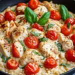 Diese cremige Hähnchen-Reis-Pfanne mit saftigen Tomaten und geschmolzenem Mozzarella ist das perfekte Komfort-Essen! 🍅✨ Einfach in einem Topf zubereitet – ideal für stressige Wochentage.