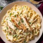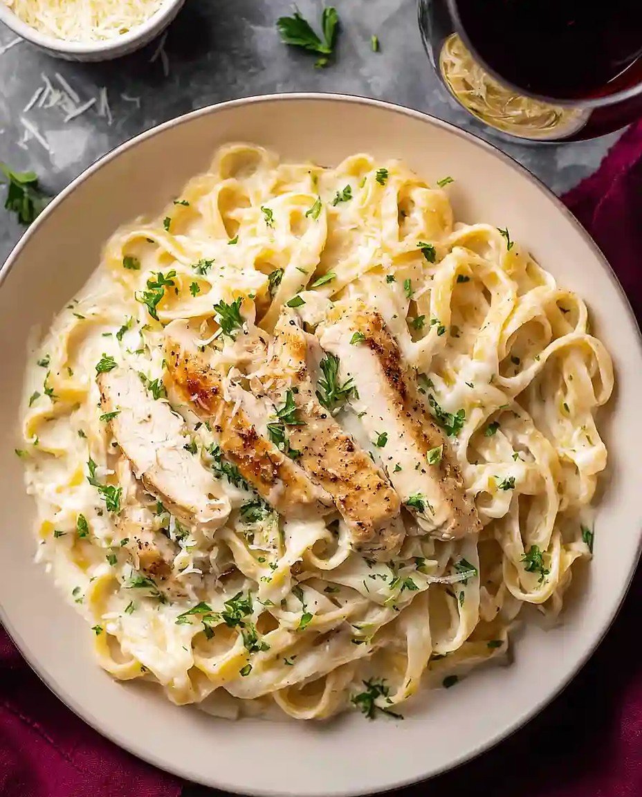 Servieren Sie die Käse-Hähnchen-Alfredo-Pasta heiß auf Tellern. Bestreuen Sie das Ganze mit frischer Petersilie für einen farbenfrohen Akzent. Genießen Sie es sofort!