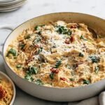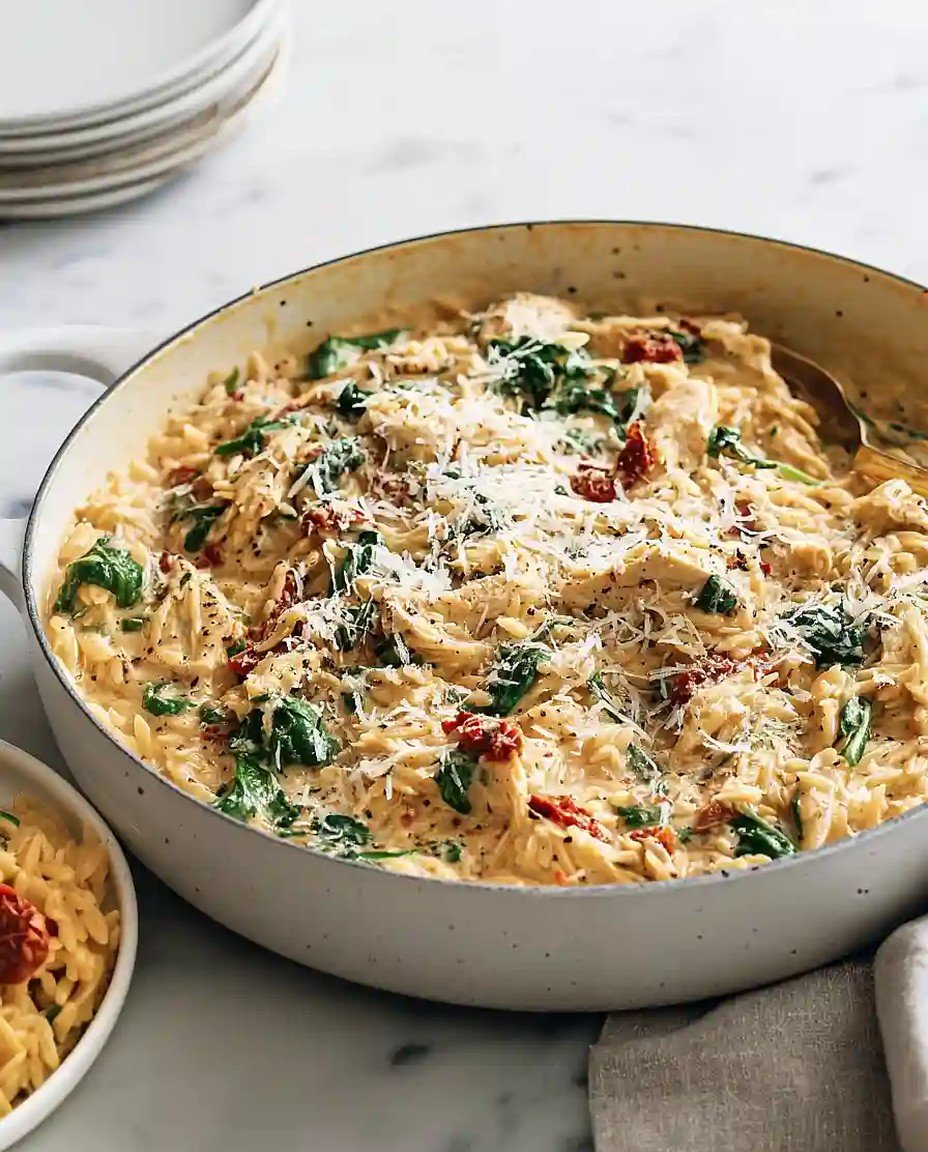 Zartes Hühnchen in cremiger Käsesoße, begleitet von perfekt al dente Orzo, vereint herzhaften Geschmack und tröstliche Aromen. Ideal für Feierlichkeiten und anpassbar mit frischem Gemüse.