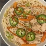 Die klassische Ingwer-Knoblauch-Hühnchen-Nudelsuppe vereint frisch geriebenen Ingwer und aromatischen Knoblauch für ein wärmendes Geschmackserlebnis. Zartes Hühnchen und weiche Nudeln ergänzen sich perfekt in dieser asiatisch inspirierten Suppe.