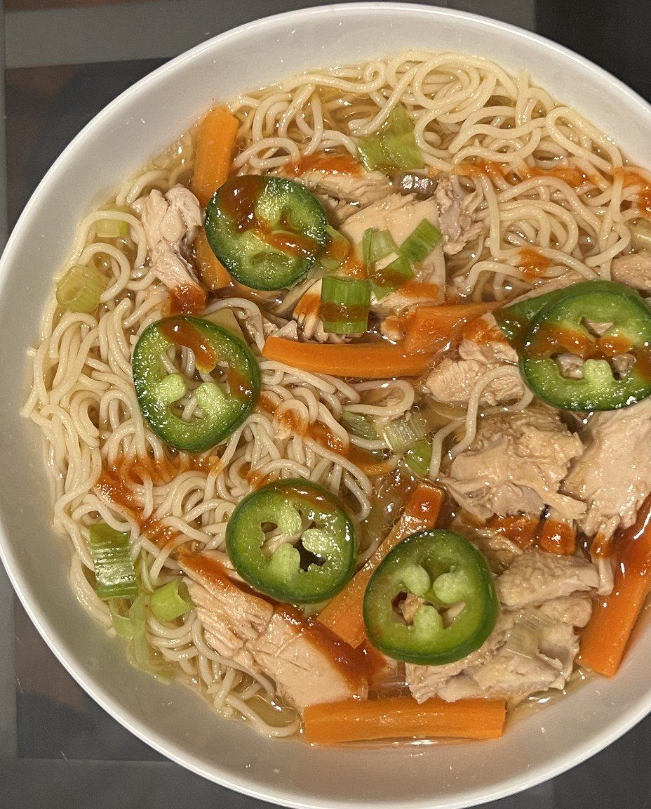 Für Ihre Klassische Ingwer-Knoblauch-Hühnchen-Nudelsuppe können Sie anstelle von Hühnchen auch Pute verwenden. Wenn Ihnen die Brühe zu intensiv erscheint, probieren Sie einfach eine leichtere Gemüsebrühe für eine sanftere Note.