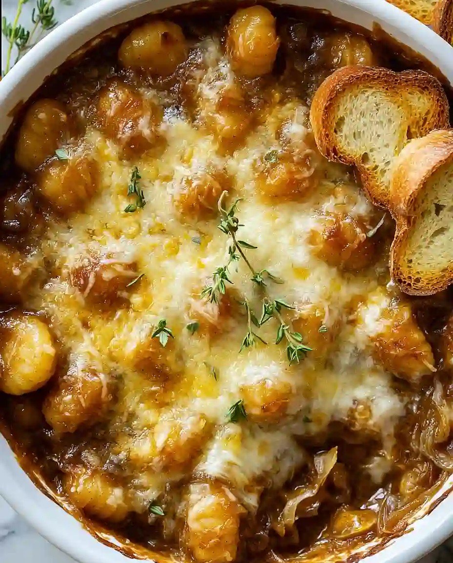 Köstliche überbackene französische Zwiebel-Gnocchi