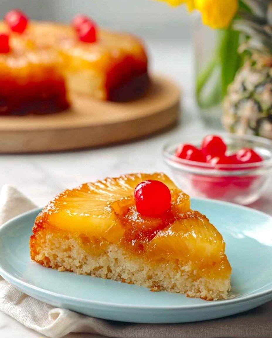 Köstlicher Ananaskuchen mit umgedrehtem Boden, dessen karamellisierte Ananasbasis und fluffiger Teig ein harmonisches Geschmackserlebnis bieten. Ideal für besondere Anlässe.