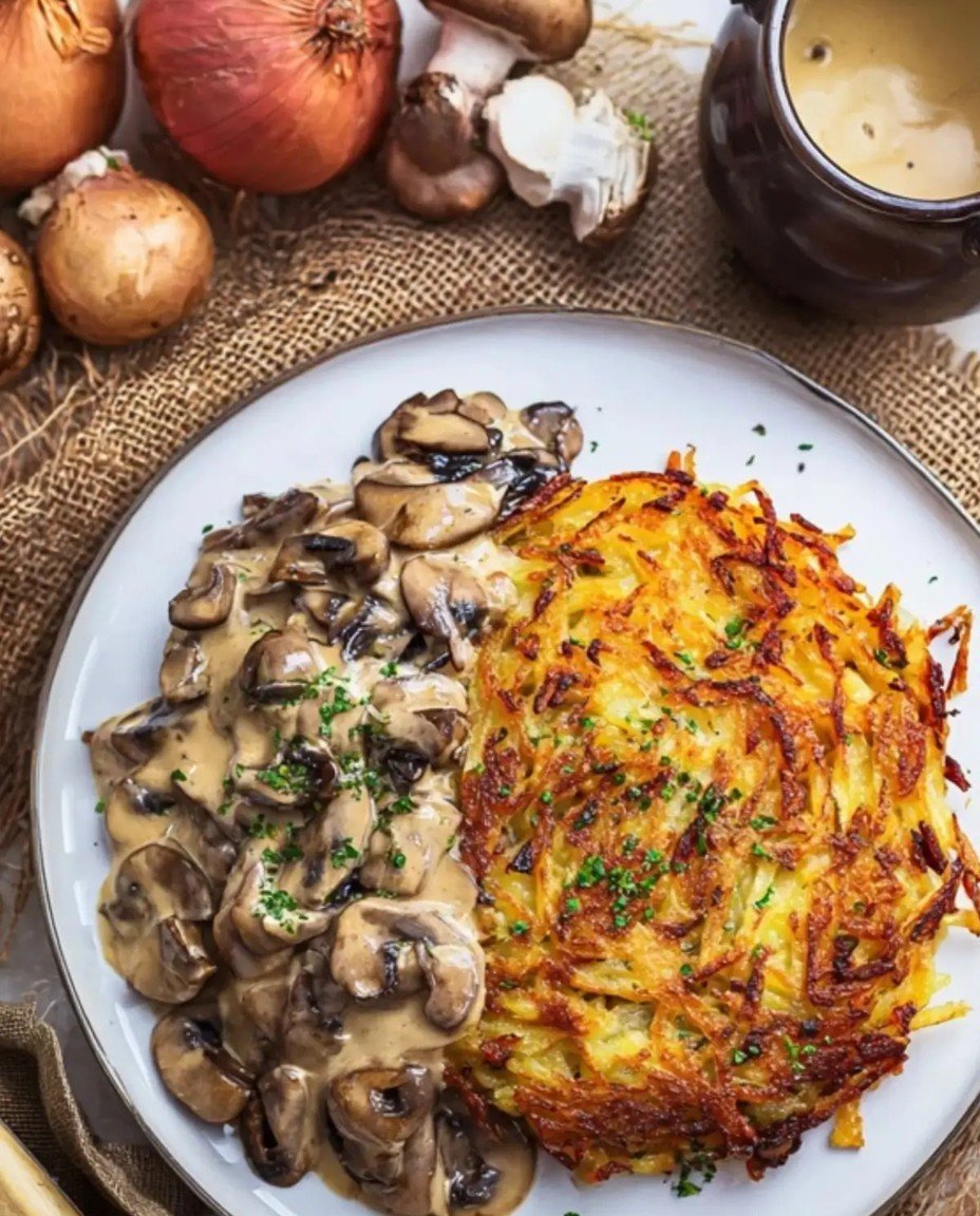 Mozzarella Rösti mit Zwiebel-Pilzrahmsoße: Einfaches vegetarisches Rezept