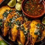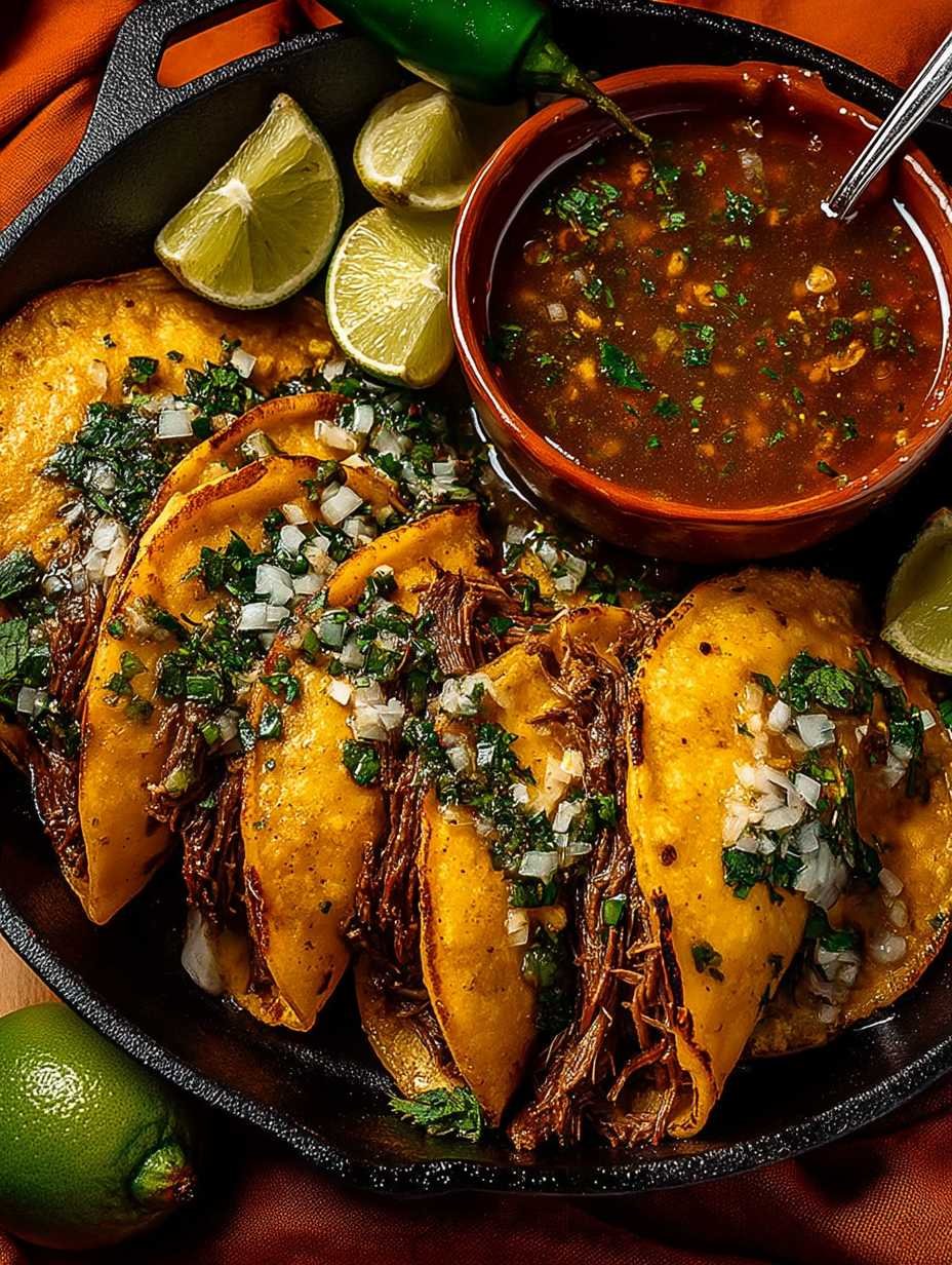 Serving: Serve birria tacos with warm tortillas filled with shredded meat, topped with fresh cilantro and diced onion. Accompany with lime wedges for squeezing over the tacos, enhancing flavor and freshness.