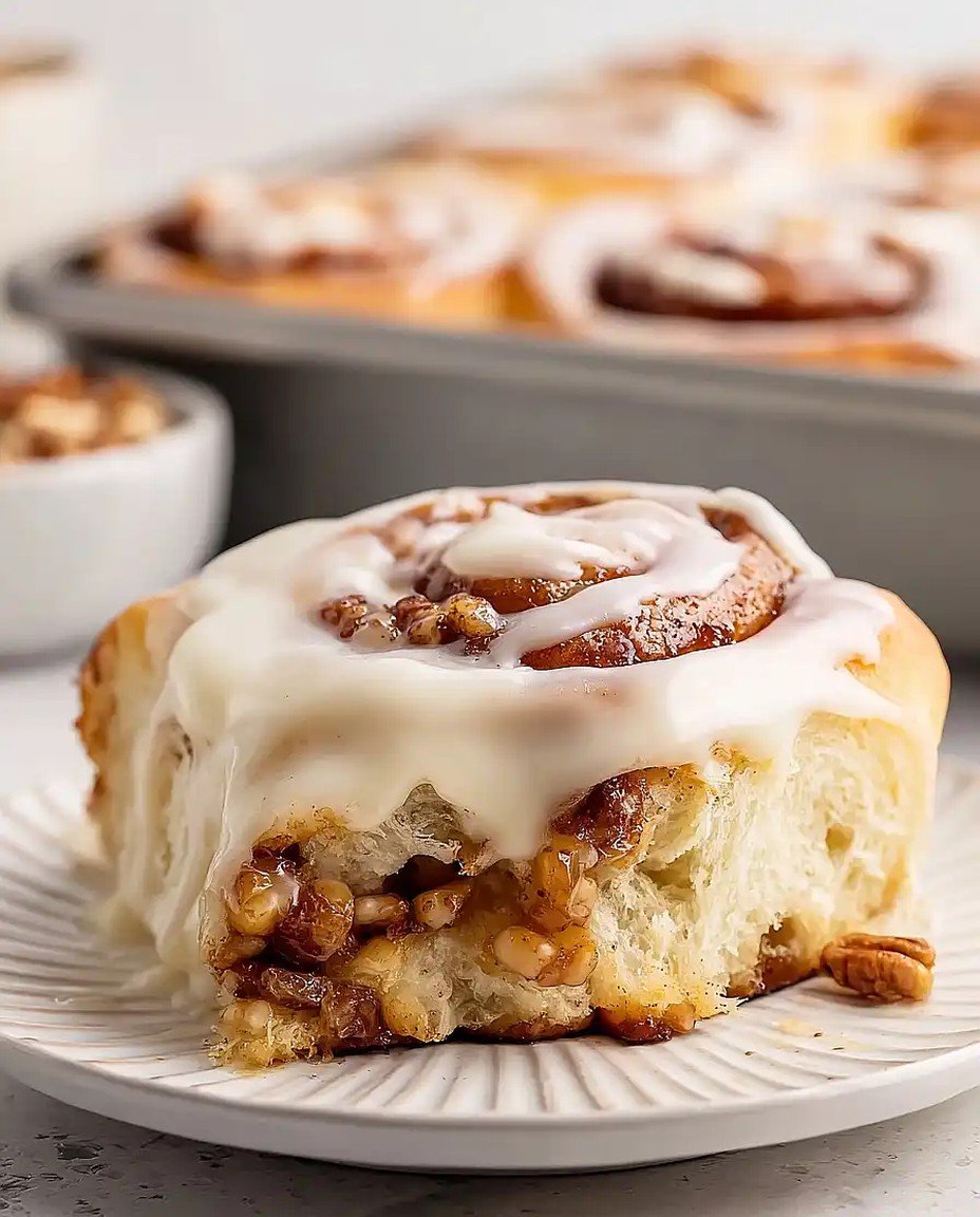 Um die weiche Textur der Pekannuss-Apfel-Zimtschnecken zu bewahren, lagere sie in einem luftdichten Behälter. Erwärme sie im Ofen bei niedriger Temperatur für ein paar Minuten, um die Frische wiederherzustellen.