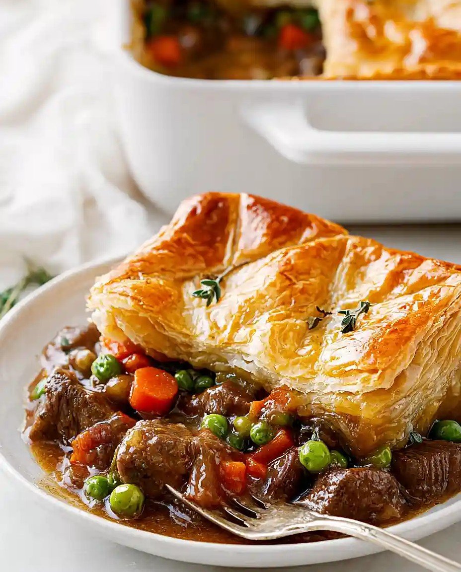 Aufbewahrung: Die Rinderpastete kann in einem luftdichten Behälter im Kühlschrank bis zu 3 Tage aufbewahrt werden. Um die Frische zu erhalten, vermeiden Sie es, sie direkt nach dem Backen abgedeckt aufzubewahren, da dies die Blätterteig-Oberfläche weich machen kann.