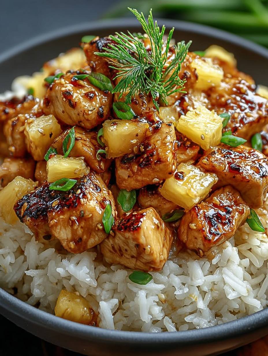 Garnish with sliced green onions and serve immediately to enjoy the vibrant colors and delightful aromas. This dish is best shared with family or friends who appreciate the finer things in life, like a perfectly balanced plate of Pineapple Chicken and Rice.
