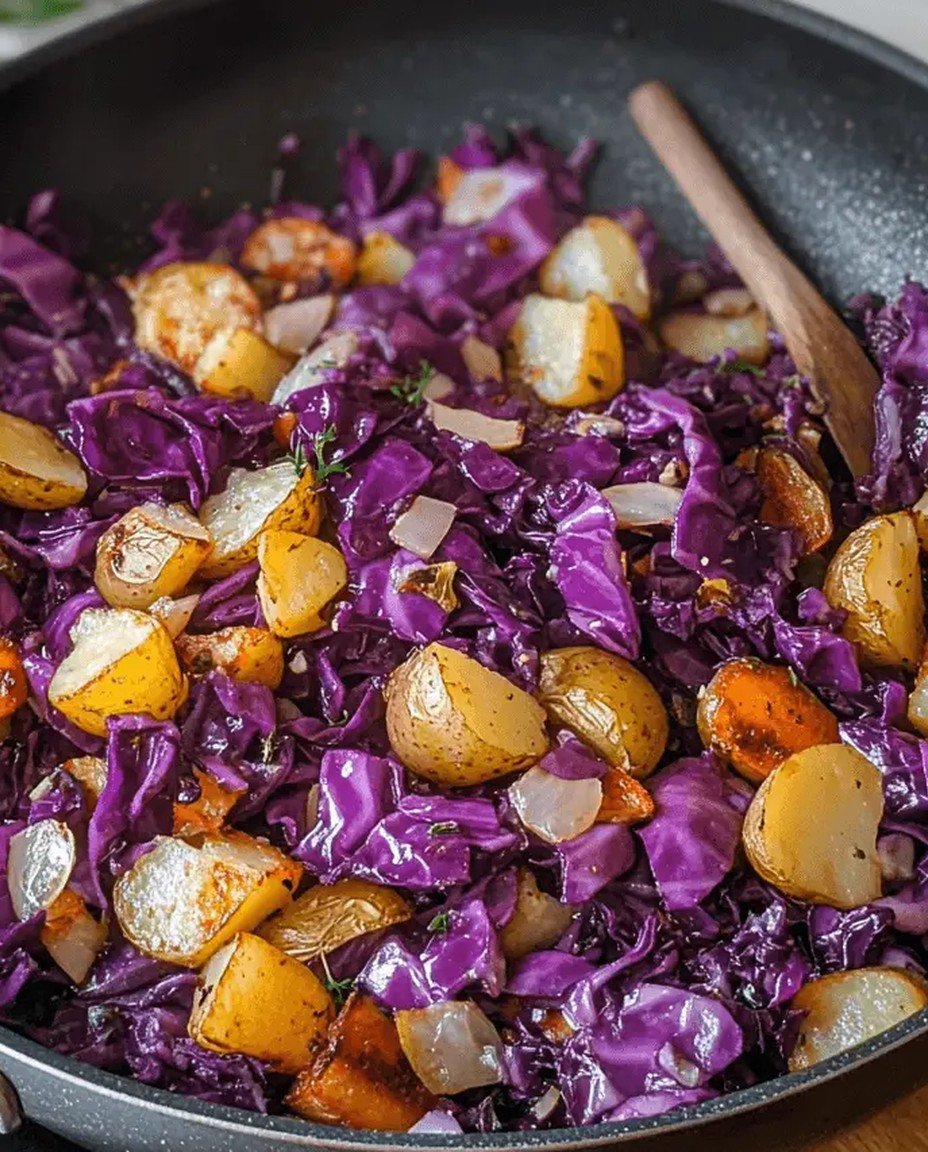 Diese Rotkohl-Pfanne mit Kartoffeln ist das perfekte Wintergericht! Der zarte Rotkohl harmoniert wunderbar mit den knusprig gebratenen Kartoffeln und sorgt für ein tolles sättigendes Gericht. Einfach lecker und gesund – ideal für ein schnelles Mittagessen oder als Beilage zu Fleischgerichten. Speichere das Rezept und genieße dieses aromatische Gericht!