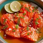 Using a sharp knife, slice the fresh salmon into thin sashimi-style pieces. Aim for about ¼ inch thickness so they’re delicate yet substantial enough to hold up against the dressing. Arrange them on a chilled plate—this is key to keeping everything fresh.