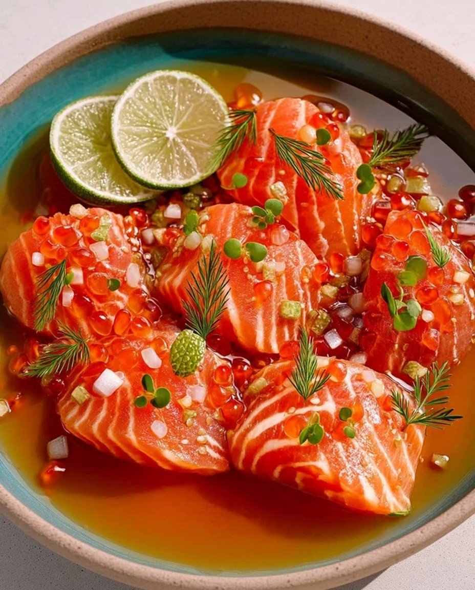 Freshly sliced salmon glistens on a plate, paired with a vibrant citrus soy dressing that dances on your palate like a sunny day at the beach. The crunch of sesame seeds and the zing of lime create a symphony of flavors that make every bite a delightful experience.