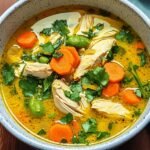 Der Duft von wärmendem Ingwer und erdigem Kurkuma steigt auf, vermischt sich mit dem sanften Aroma von zartem Hühnchen und frischem Gemüse, während ein goldener Dampf aus dem Topf emporsteigt und die Küche erfüllt. Dies ist kein gewöhnliches Gericht; es ist eine Umarmung von innen, ein Versprechen von Behaglichkeit und Vitalität.